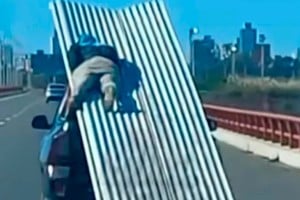 Las imágenes fueron captadas por otro conductor que circulaba por la zona. En el video se observa al hombre sobre los materiales, aparentemente intentando evitar que las chapas se desprendieran durante el traslado.