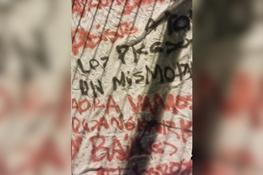 “Patricia Bullrich, metiste a todos los presos en un mismo pabellón, ahora vamos a desangrar Rosario y Buenos Aires”, indica el texto escrito sobre una tela blanca y con letras de color rojo y negro. "Los vamos a meter presos a todos. Se les acabó la joda", fue la respuesta de la funcionaria