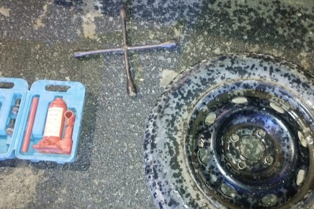 Siendo las 2, una patrulla arribó al lugar y entrevistó a la víctima, quien manifestó que dos hombres le sustrajeron la rueda auxiliar y herramientas varias de su auto.