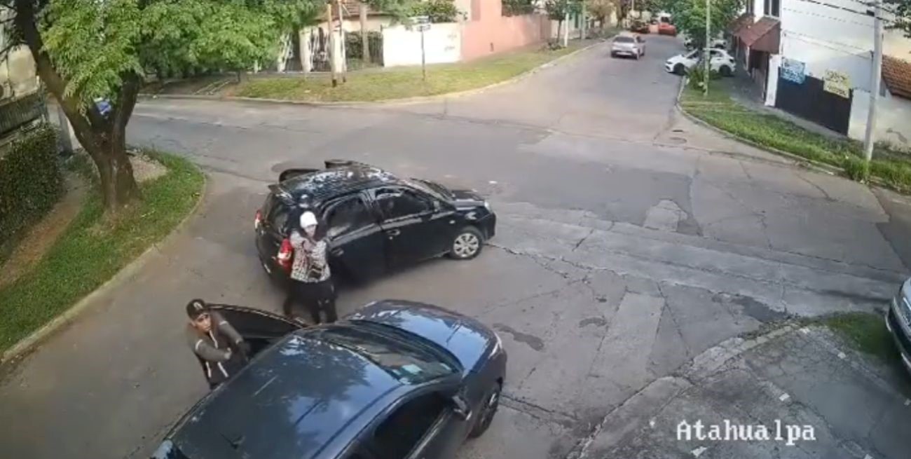 Las imágenes de las cámaras de seguridad captaron el momento en el cual cuatro delincuentes se bajaron de un Toyota Etios y apuntaron hacia el interior del vehículo donde estaba el gendarme, junto a un compañero de la fuerza.