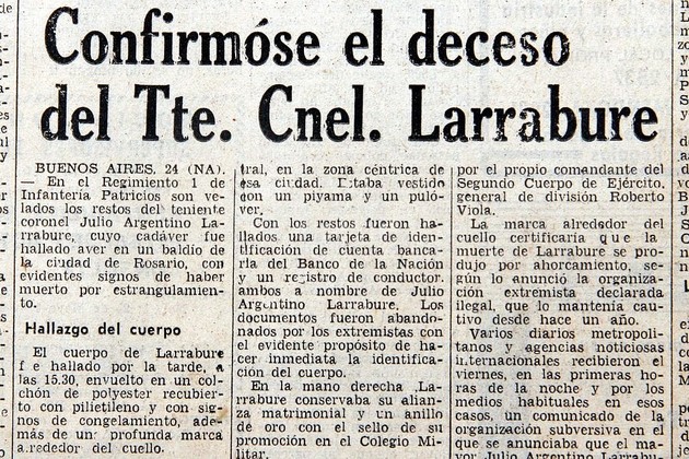 El coronel Larrabure fue secuestrado el 10 de agosto de 1974 en la fábrica militar de Villa María, en Córdoba, tras una acción emprendida por el ERP, y el 23 de agosto de 1975 su cuerpo apareció en Rosario.