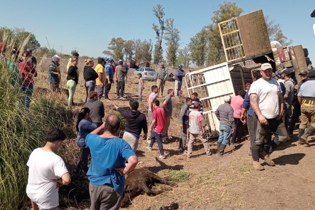 La madrugada del jueves dejó una postal insólita y peligrosa en el kilómetro 505 de la Ruta Nacional 11, a la altura de Nelson. Allí, un camión jaula cargado con 96 animales perdió el control en una curva y terminó volcado sobre la banquina.