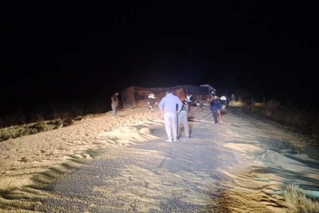 El siniestro vial tuvo lugar pasadas las 21.30 en esta ruta provincial transversal que nace en la Ruta Nacional Nro. 11. El camión quedó totalmente cruzado en el camino con mucha carga tumbada.