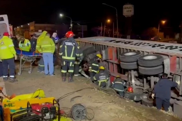 En la caída, el camión aplastó al auto y el acoplado cayó sobre la cabina del vehículo, lo que provocó la muerte del camionero. Hasta pasadas las 7 de la mañana las grúas trabajaban para rescatar a todos los integrantes de la familia.
