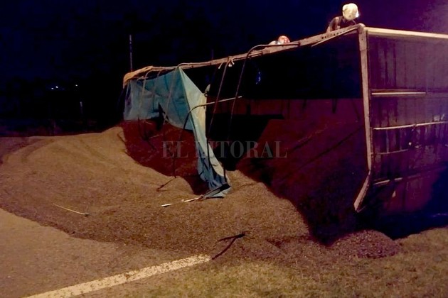 Un camión cargado de cereal protagonizó un vuelco en la rotonda que entrelaza las rutas provinciales Nº 13 y Nº 40-S, en el distrito de El Trébol, departamento San Martín.