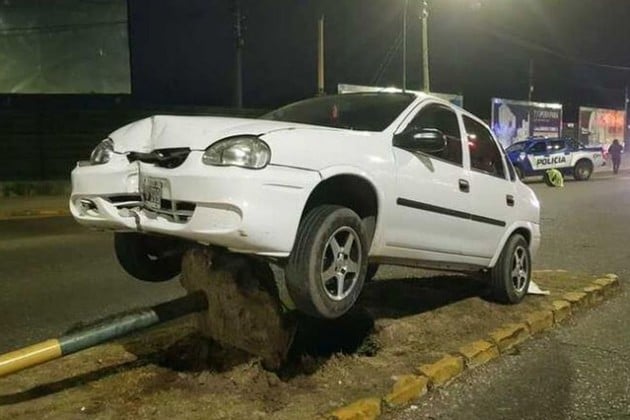 El auto en el que se desplazaban los chicos intenta doblar en U, y terminan rozando contra el otro vehículo que venía circulando en mano contraria. Por el incidente, el conductor del Corsa pierde el control y termina chocando contra el semáforo. El auto quedó colgado, mientras que el VolksWagen Up quedó a un costado.