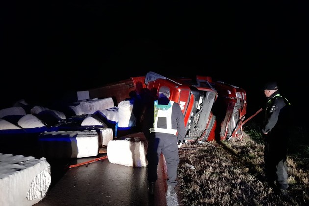 Si bien las circunstancias exactas del choque aún se investigan, se presume que el camión Volvo colisionó contra la parte trasera del acoplado del camión Mercedes Benz, provocando que este último volcara sobre la ruta.