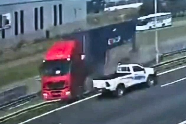 Una cámara de seguridad vial registró el momento exacto en que se desata la tragedia. Todo comenzó cuando un camión mosquito, que circulaba vacío por el carril central, perdió una rueda. Detrás suyo, a unos 150 metros, viajaba a alta velocidad un camión cargado con verduras.