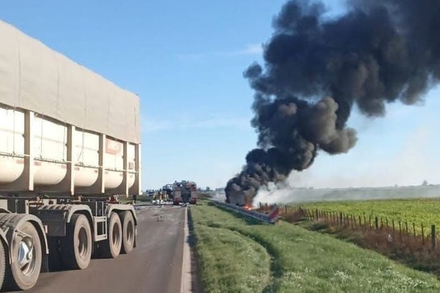 Según se desprende de las primeras hipótesis se trataría de una maniobra de sobrepaso por parte de uno de los camiones, siendo un camión tipo batea el que sufrió el mayor impacto, el cual terminó incendiándose y se propagó a la unidad de emergencia donde viajaban un médico (Paulino P.) de la localidad de San Gregorio de unos 40 años y el chofer (Fernando F.) del SIES 107 Venado Tuerto, de unos 50 años, quienes fallecieron en el lugar. Ambos vehículos fueron totalmente consumidos por el fuego.