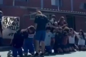 En los videos que circularon se observa a varios estudiantes con pasamontañas recorriendo los pasillos del establecimiento e ingresando a las aulas. Después, ya en el patio, la secuencia escala: aparecen con armas de juguete, ubican a otros compañeros de rodillas y recrean un simulacro de fusilamiento que culmina con los chicos cayendo al piso al ritmo de un audio con detonaciones.