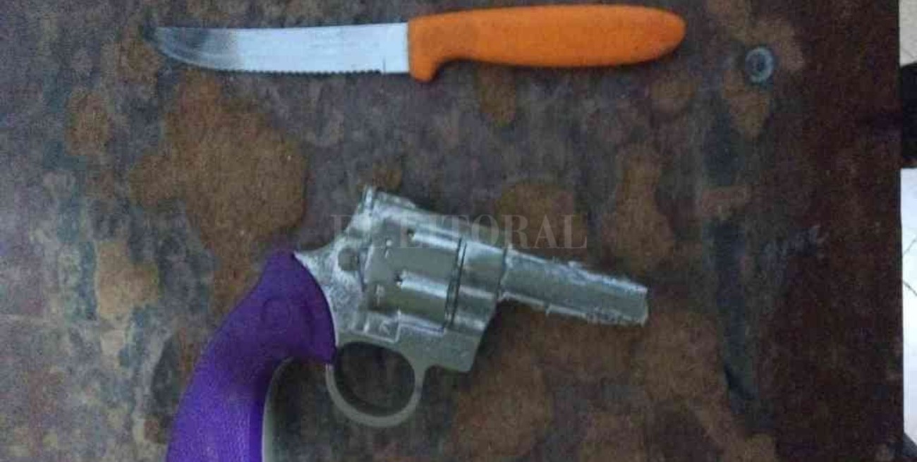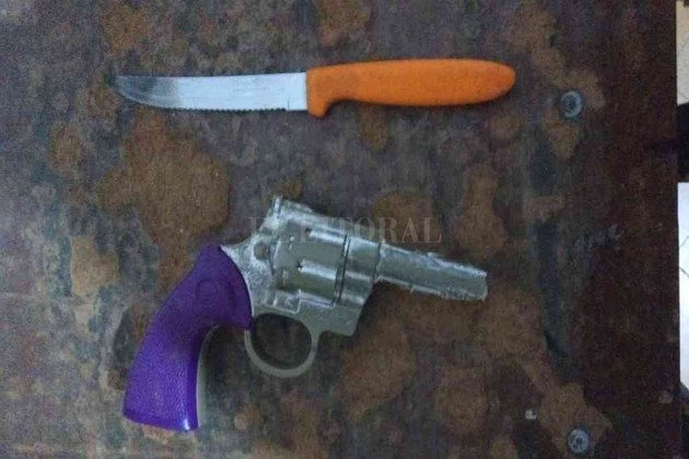 Los efectivos verificaron la zona en procura del sindicado, logrando divisarlo e interceptarlo a escasos metros. Tras realizarle el correspondiente cacheo, los agentes desde sus prendas obtuvieron el secuestro de una réplica de revólver y un cuchillo.