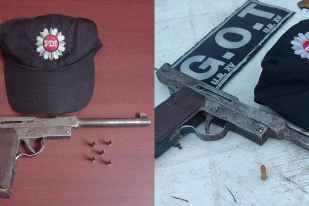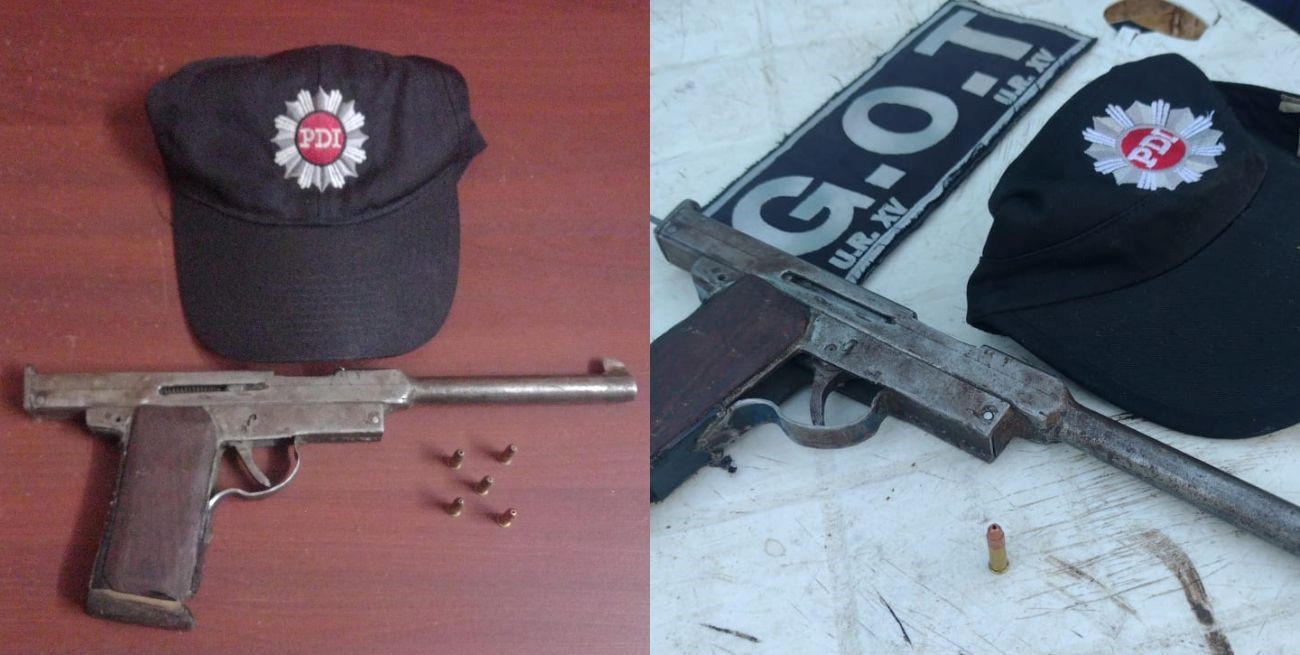 El arma secuestrada por las fuerzas de seguridad. Es una pistola de fabricación casera, calibre 22 y tenía 6 balas intactas. Crédito: Unidad Regional XV de Policía y PDI