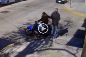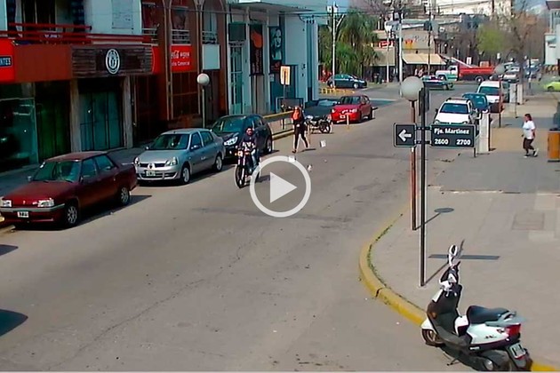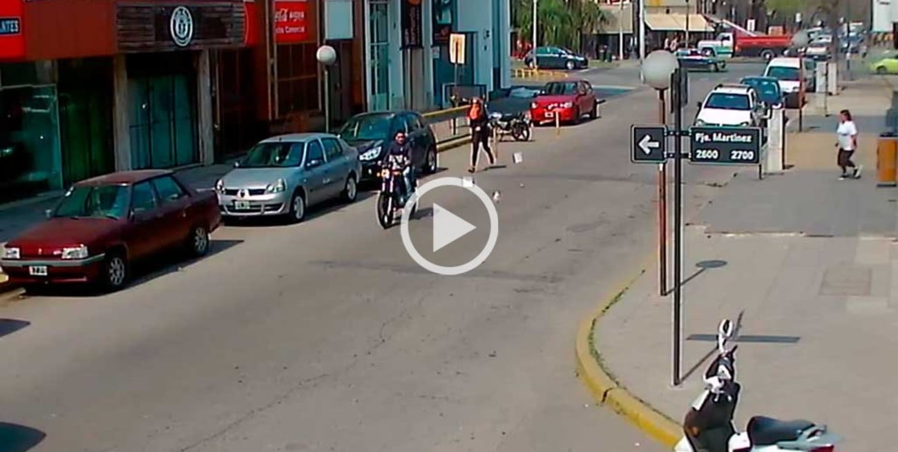En menos de 10 segundos, una mujer es víctima de un episodio de inseguridad en la ciudad de Santa Fe. Un sujeto que circula en moto, pasa a toda velocidad a centímetros de ella y le arrebata su cartera.