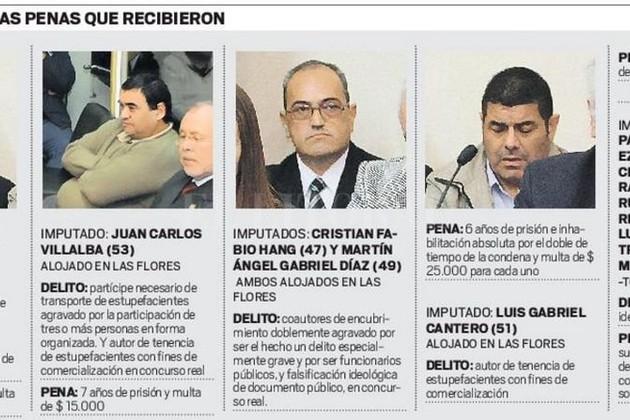 Alejandro Agüero recibió la pena más alta, 12 años de cárcel por el transporte del cargamento, agravado por su condición de policía y por el número de personas. Con él fue considerado partícipe principal Juan Carlos Villalba, que recibió la pena de 7 años. Los jefes policiales Cristian Fabio Hang y Martín Ángel Díaz recibieron 6 años de pena y multas de $ 25.000 cada uno por encubrir el accionar delictivo y falsear el acta. Mientras que Luis Gabriel Cantero fue condenado a 4 años de prisión por tenencia de estupefacientes con fines de comercialización en una causa anexa a la principal. Los otros siete policías de menor rango fueron sentenciados a dos años en suspenso por haber suscripto un acta cuyo contenido sabían falso.