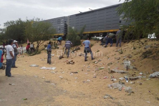 A los pocos minutos, un grupo de personas se acercó y comenzó a llevarse en baldes y bolsas la soja que llevaba el tren.