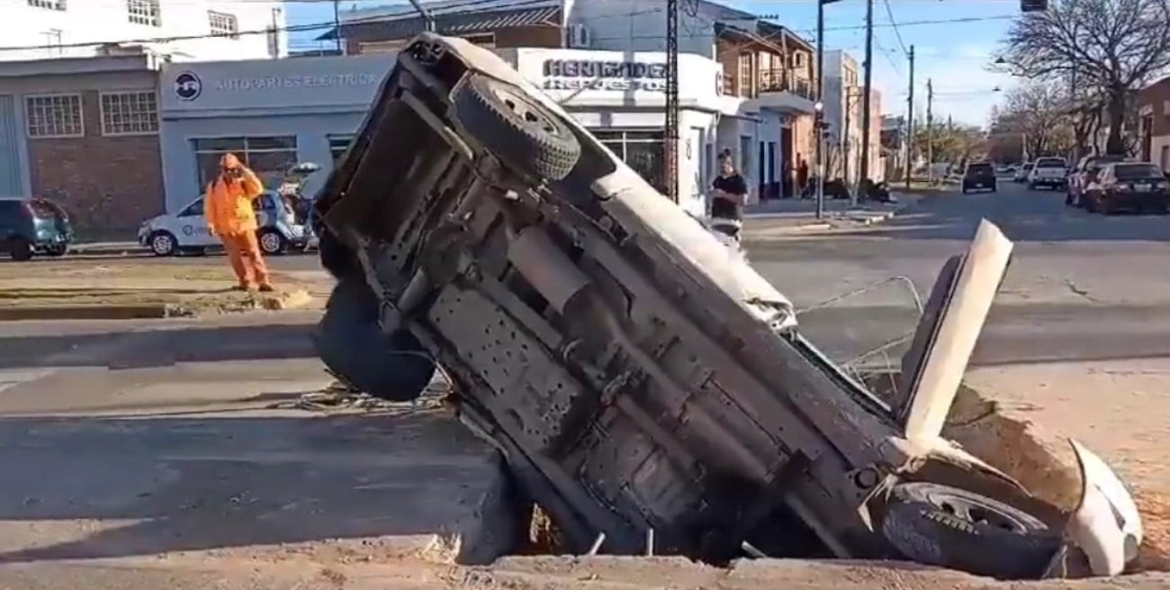 La camioneta, en la que sólo circulaba el conductor, quedó incrustada dentro del pozo de dos metros de costado. Requirió la intervención de personal municipal para retirarla.