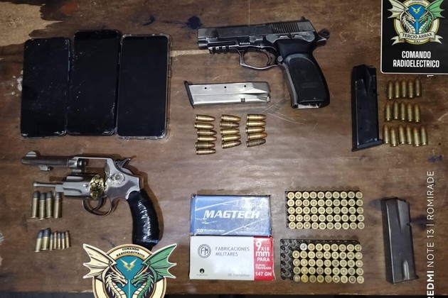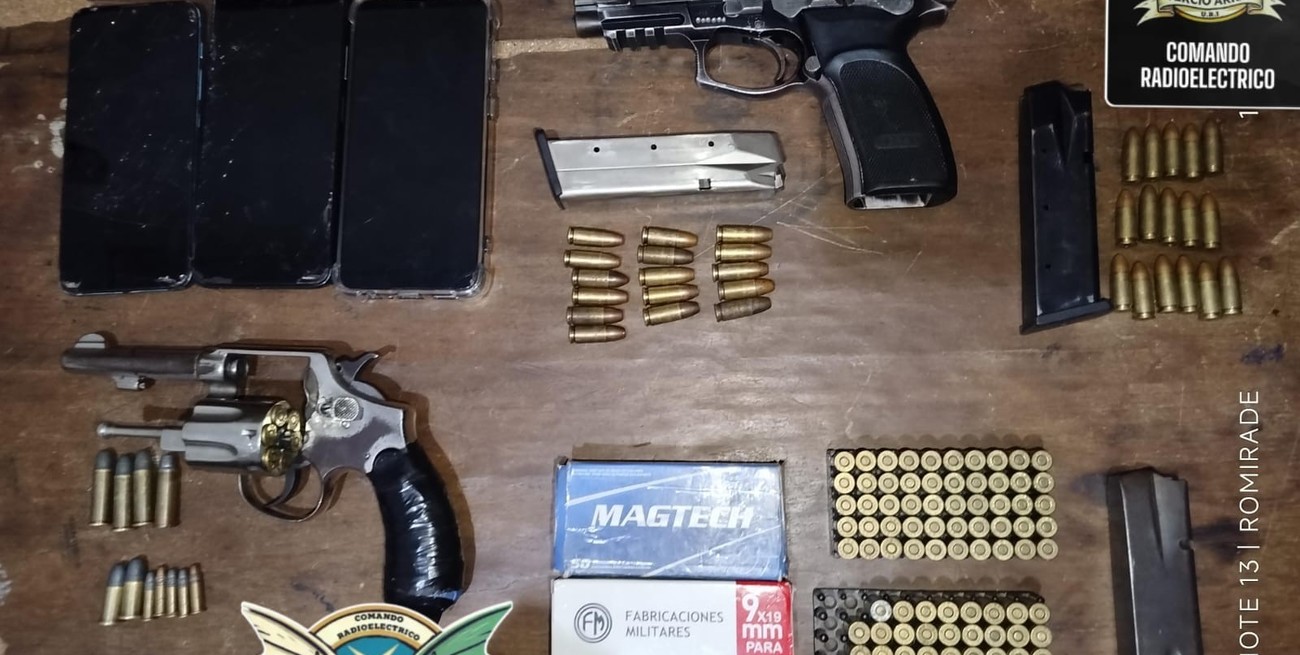 A pocos metros, al pie de un árbol, fue encontrada una mochila azul que escondía un verdadero arsenal: una pistola Bersa Thunder Pro 9 mm con numeración suprimida, tres cargadores (dos de ellos cargados con 16 proyectiles cada uno), dos cajas de municiones (una con 50 balas, otra con 44), cartuchos sueltos de distintos calibres y tres teléfonos celulares.