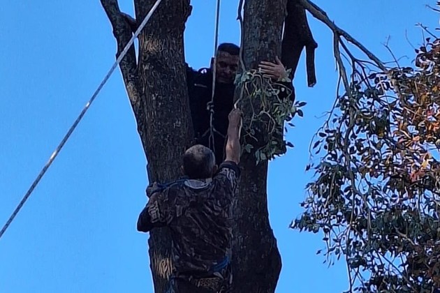 Con elementos improvisados en el lugar, tomaron las cuerdas de sujeción del jardinero para diseñar un arnés de seguridad. Uno de los oficiales ascendió por una escalera y trepó el árbol con maniobras tácticas.