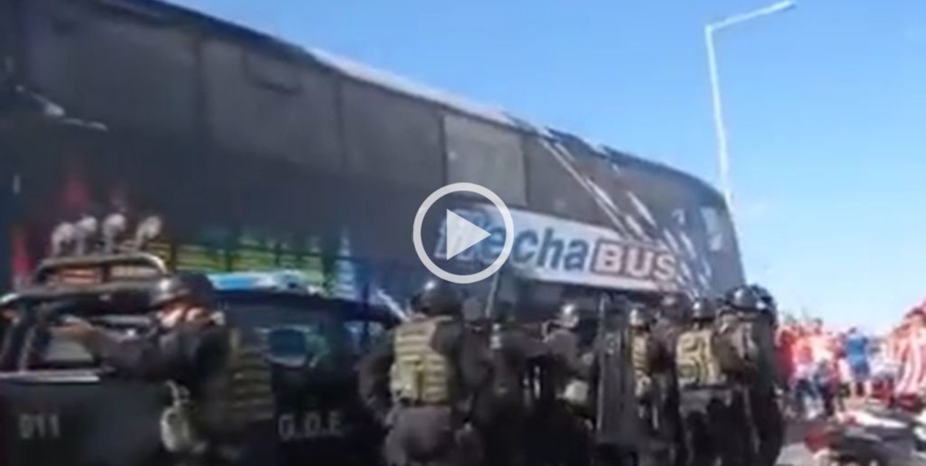 En esta parte se generó un tumulto con acciones de violencia que iban en aumento. Algunos de los hinchas comenzaron a arrojar bengalas, como así elementos contundentes y patadas contra los móviles policiales que custodiaban el colectivo.