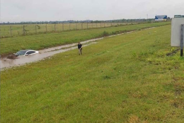 Al momento de la llegada de la Policía, el auto había quedado sumergido en el agua de un zanjón que está a la vera de la traza vial.