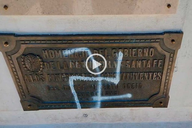 Manos anónimas dibujaron una cruz esvástica en un obelisco ubicado cerca del centro de la Plaza de Mayo, frente a la Casa Gris y a los tribunales de la capital provincial. Fue descubierta este viernes, en horas de la siesta.