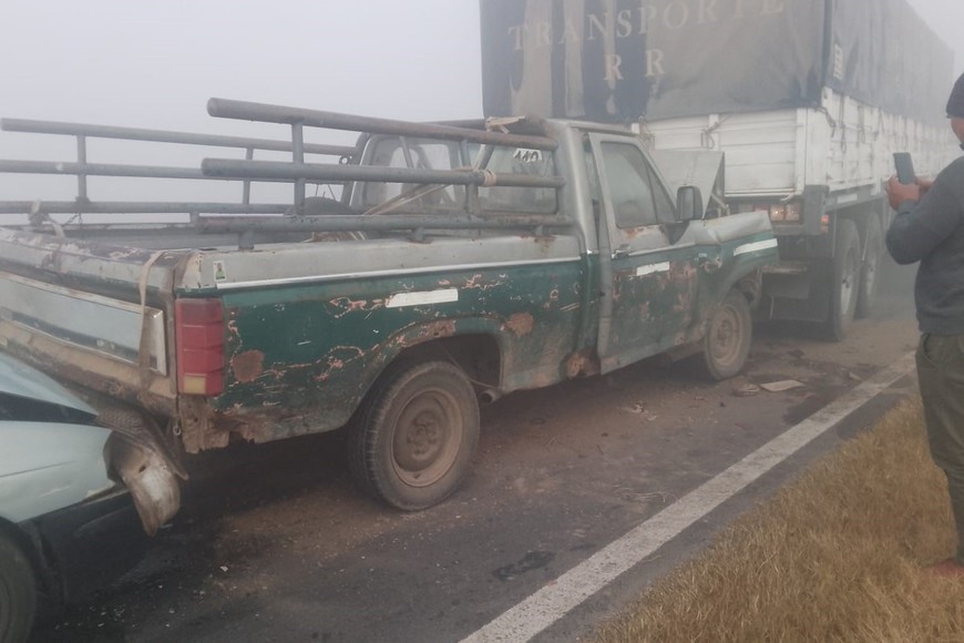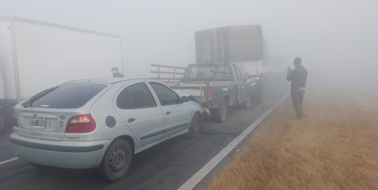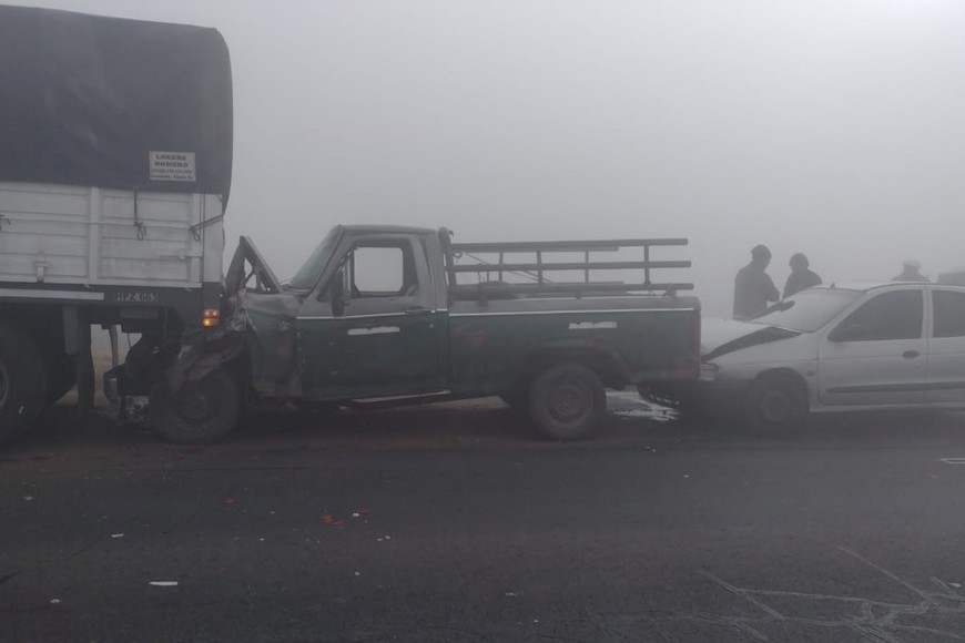 Por circunstancias a determinar pero también Con el detalle de la existencia de una densa niebla que reinó en toda la región, se registró un choque en cadena entre un camión Iveco, una camioneta marca Ford F 100 y un automóvil Renault Megane.