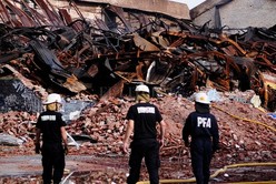 Mientras se extinguía el fuego en el interior una pared de diez metros de alto se derrumbó hacia la calle y aplastó a ocho bomberos y dos agentes de Defensa Civil.