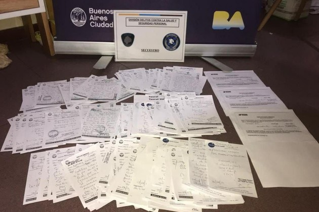 Durante el operativo, en el que se encontró presente la neurocirujana, se secuestraron aptos físicos, prescripciones médicas y certificados laborales, y también se encontraron nueve recetas de otros médicos, dos sellos de la mujer, cinco sellos de otros especialistas, talonarios y "otros elementos de interés para la causa".