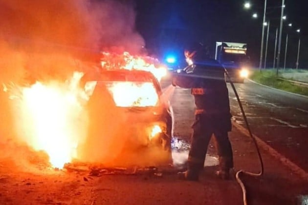 El aviso movilizó al personal de Bomberos Zapadores que al arribar a la zona de la bomba 02 se encontró con un cuadro ya declarado: combustión generalizada, con el vehículo prácticamente tomado en su totalidad. La escena, iluminada por el propio incendio, dejaba ver la silueta de un Mercedes Benz, modelo A200, propulsado a nafta, que ardía sin control, con su frente apuntando hacia el norte.