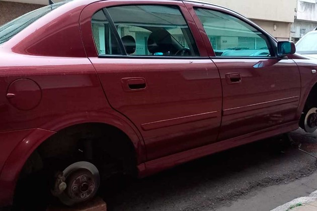 Los ladrones se llevaron las ruedas derechas, es decir las que estaban del lado del cordón y dejaron un ladrillo y un gato hidráulico para que no se caiga el vehículo.