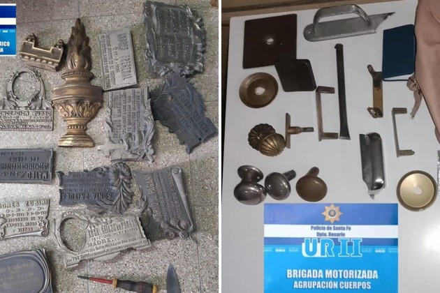 En las últimas horas policías de Rosario y de Las Rosas secuestraron más de 100 elementos de bronce, entre estos, placas y crucifijos del cementerio y medidores de agua. En todos los casos, los agentes aprehendieron a quienes los sustrajeron y los trasladaron a las dependencias policiales correspondientes.