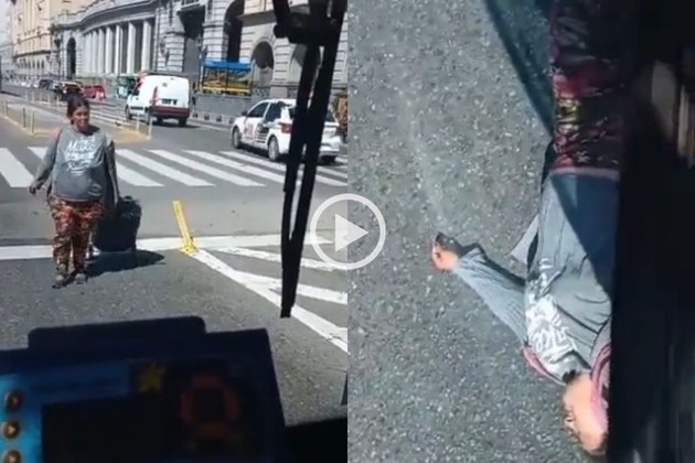 Las imágenes muestran a una mujer salir caminando de la estación de forma cansina mientras cargaba una valija y llevaba una mochila rosa. Extrañamente, la señora en cuestión comenzó a circular por el medio de la calle, hecho que llamó la atención del chófer de un colectivo.