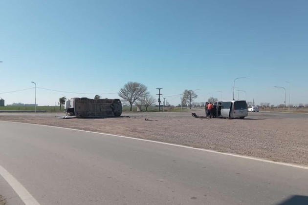Cerca del mediodía de este lunes se registró en el peligroso cruce de las Rutas Provinciales 80s y 10s un siniestro vial entre un vehículo tipo mini van conducido por un empresario de la ciudad de Gálvez, acompañado por varias personas, contra una combi que terminó volcando.