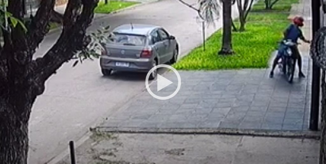 Una cámara de seguridad particular captó la escena: mientras una señora, su hija y su pequeño nieto ingresaban a su domicilio en Derqui al 1600, un sujeto a bordo de una motocicleta - que circulaba en contramano - subió a la vereda, detuvo el vehículo en la puerta y les apuntó con un arma.