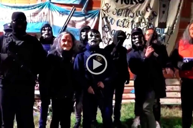 “Queremos arrancar diciendo que si mañana van a tomar medidas contra nuestro líder, acá estamos, pero de verdad. Nosotros estamos con vos, Pata, Puly, 100%”, dice uno de los protagonistas que aparecen fuertemente armados, con máscaras y hasta un chaleco policial.