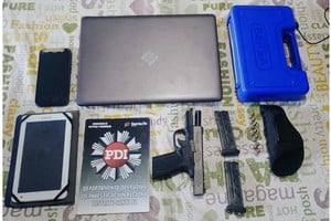 158 cartuchos calibre 9mm intactos,(01) Chaleco refractario con la inscripción "policía", una pistolera interna y cajas de armamento.
