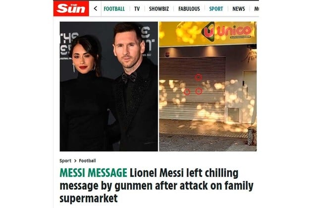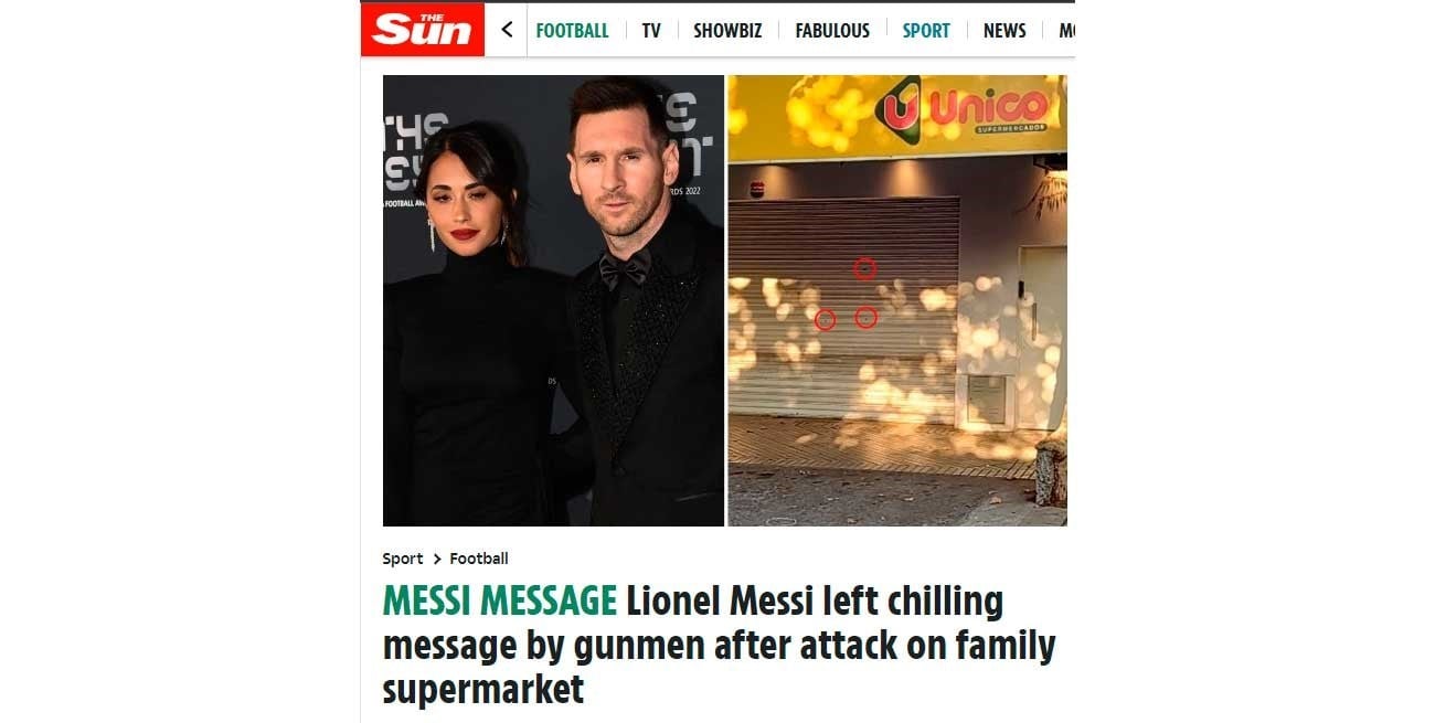 "Hombres armados dejaron un escalofriante mensaje a Lionel Messi en el ataque al supermercado de la familia de su esposa", fue el título del Mirror. "Supermercado propiedad de los suegros de Lionel Messi es asaltado por sicarios 'que exigen dinero al futbolista'", título el Daily Mail. “Hombres armados dejaron un escalofriante mensaje a Lionel Messi después de atacar su supermercado familiar”, destacó The Sun.