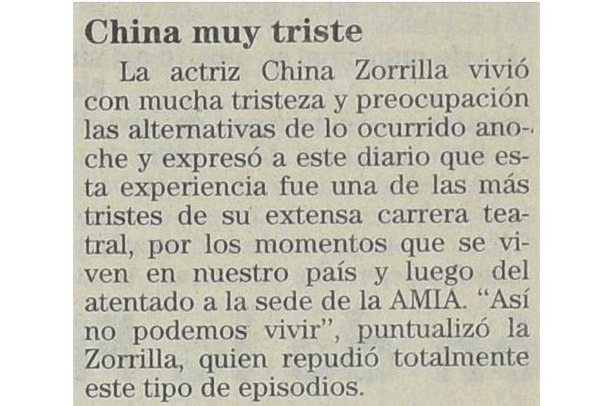“Así no podemos vivir”, remató China Zorrilla al ser entrevista por el diario El Litoral en el Teatro Municipal. Con mucha tristeza y preocupación, la actriz repudió totalmente este tipo de episodios, calificándolo como el hecho más triste en toda su carrera. Parar la obra, bajarse del escenario y despejar la sala, fue una secuencia que respondía más al orden de la ficción que la propia obra de teatro protagonizada por la gran estrella China Zorrilla.