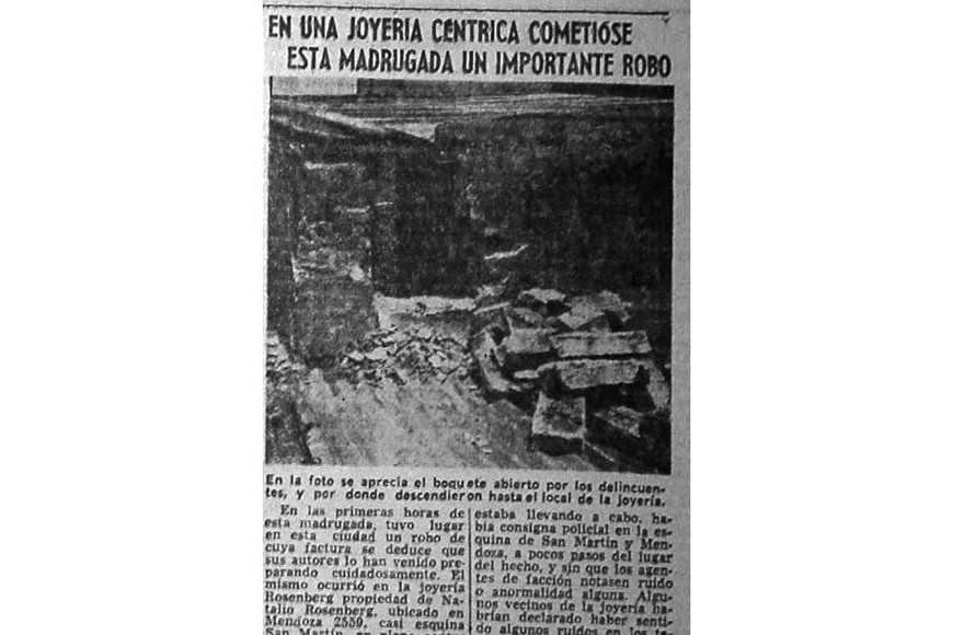 “En las primeras horas de esta madrugada, tuvo lugar en esta ciudad un robo de cuya factura se deduce que sus autores lo han venido preparando cuidadosamente. El mismo ocurrió en la joyería Rosenberg, ubicada en Mendoza 2550, casi esquina San Martín, en pleno centro de la ciudad”, introducía el tema la crónica policial del vespertino.