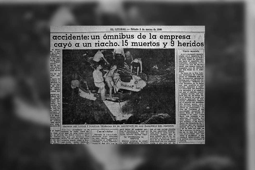 Acompañado por varias imágenes del accidente y de los posteriores rescates, El Litoral detalló: “El colectivo quedó sumergido en las aguas, que en el lugar tienen una profundidad de unos 3 metros, y solamente se veían en la superficie las ruedas”. La nota indicaba que minutos después de producirse la caída, comenzaron a llegar las primeras personas al lugar, quienes dieron aviso a las autoridades.