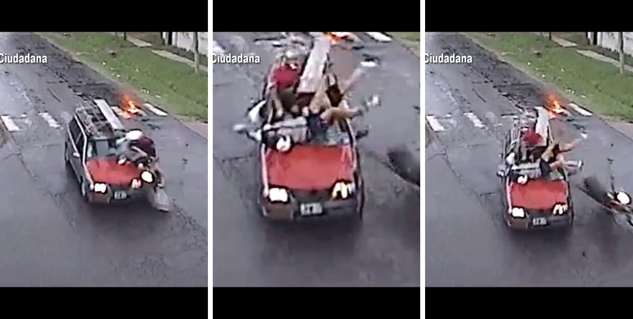 El choque fue de tal violencia que los dos ocupantes de la motocicleta volaron por el aire, pasaron sobre el capó de la camioneta y cayeron con fuerza sobre el asfalto.