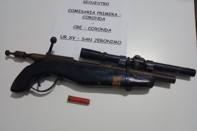 Se trata de una tumbera, con sistema de disparo tiro a tiro con cerrojo con palanca, no municionado, con cañón recortado de unos 15 cms. de largo, culatín y guardamanos de madera en color negro, con largo total de unos 35 cms., sin numeración ni marca visible, contando además con una mira telescópica adosada a la parte superior del arma unida y sujeta con precinto color negro, más un cartucho intacto separado del arma, vaina plástica de color rojo y culote metálico con inscripción "Cbc 36".