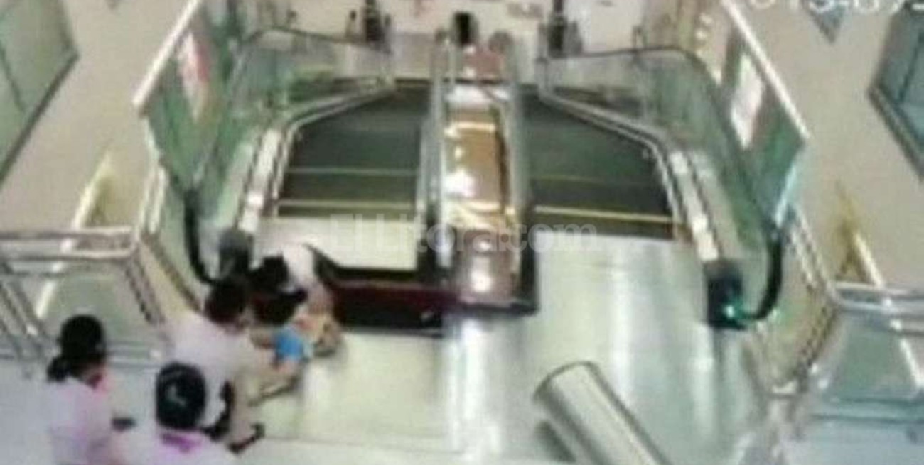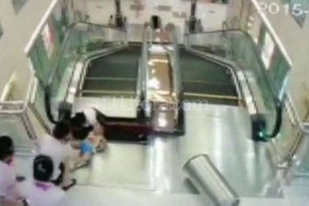En las imágenes se observa cómo la mujer y el niño subieron con normalidad las escaleras mecánicas que ascendían del quinto al sexto piso del edificio, pero al llegar al final, la placa metálica que ejerce de transición entre los escalones y el suelo del edificio se hundió cuando los dos estaban sobre ella.