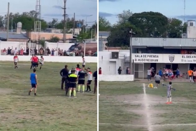 Además, en los videos que circulan en redes sociales se puede observar cómo un futbolista de Villa Zorraquín, identificado con el número 18, golpeó y tiró al suelo al entrenador de arqueros del “Lobo”, que tiene una pierna ortopédica.