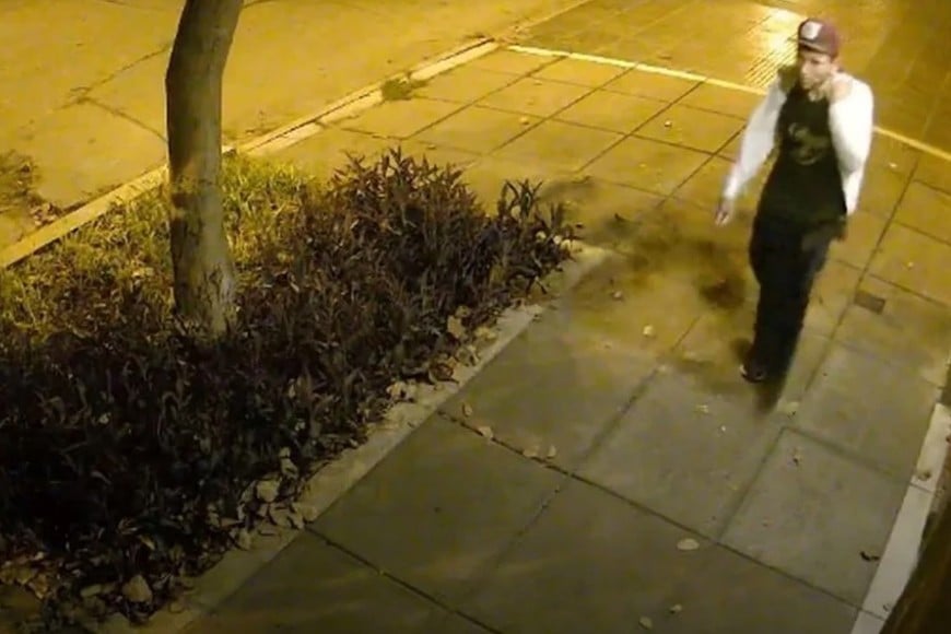 La brutalidad del asalto conmocionó al barrio. Un testigo aportó imágenes de una cámara de seguridad, donde se observa a un hombre con ropa oscura y gorra roja salir apresuradamente del domicilio.