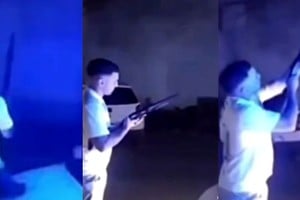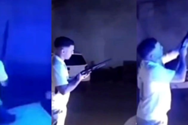 La grabación muestra al joven policía vestido de civil, en el estacionamiento de la Comisaría 1°, lugar donde cumplía funciones. En las imágenes se lo ve sosteniendo una escopeta mientras, de fondo, suenan las campanas de la Iglesia Nuestra Señora del Carmen anunciando la llegada de la Navidad.