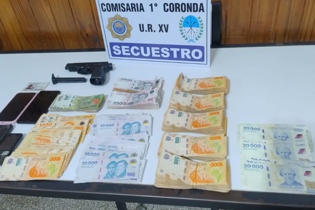 Una réplica de arma, teléfonos y más de 1 millón de pesos, de incierta procedencia, al tercero investigado. Unidad Regional XV.
