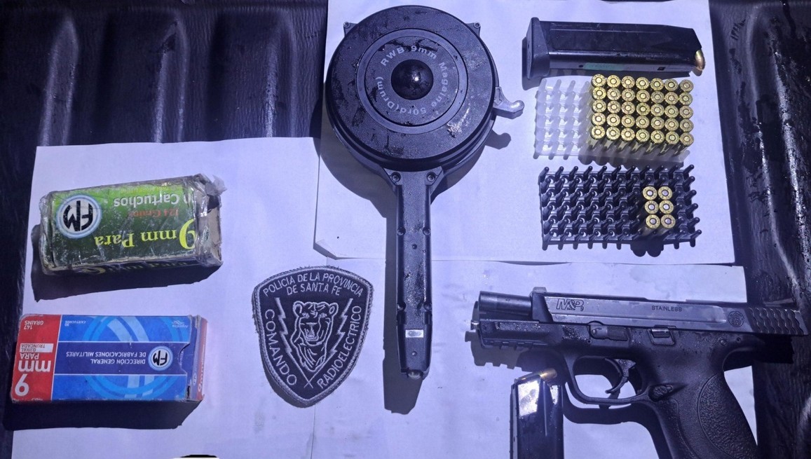 Otra actividad policial, fue concretada en calle Riobamba al 6000, cuando los agentes estaban recorriendo la zona e interceptaron a un hombre y luego de realizarle una riqueza personal, le secuestraron un arma de fuego calibre 9 mm, cargadores y cartuchos.