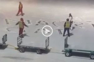 Las imágenes fueron captadas por pasajeros, que a través del vidrio observaron cómo los empleados encargados de subir y bajar los equipajes de los aviones formaban con sus pies la frase “Macri gato” sobre la nieve, que en ese momento era abundante.