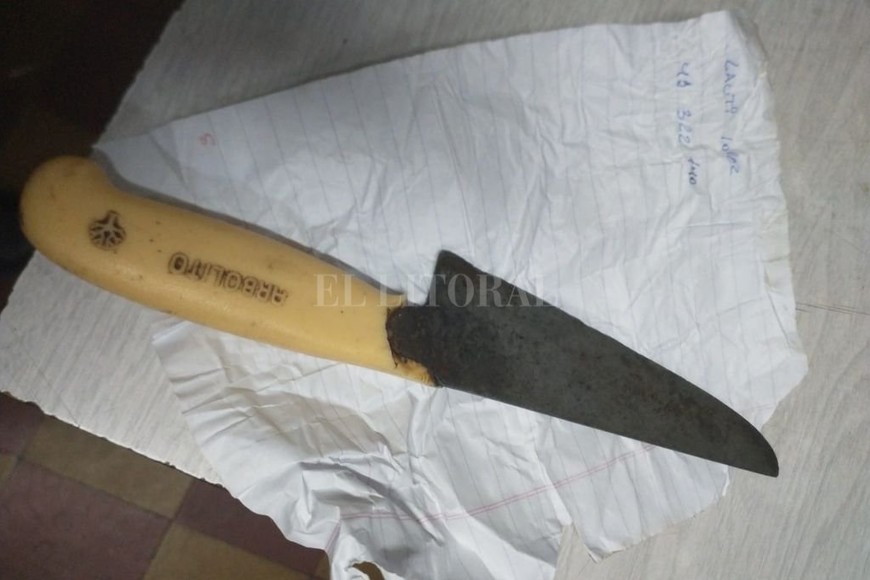 En el chequeo de rigor se determinó que el joven entre sus prendas trasportaba una cuchilla con mango de color beige marca arbolito de 17 cm de hoja envuelta en una hoja de carpeta rayada.